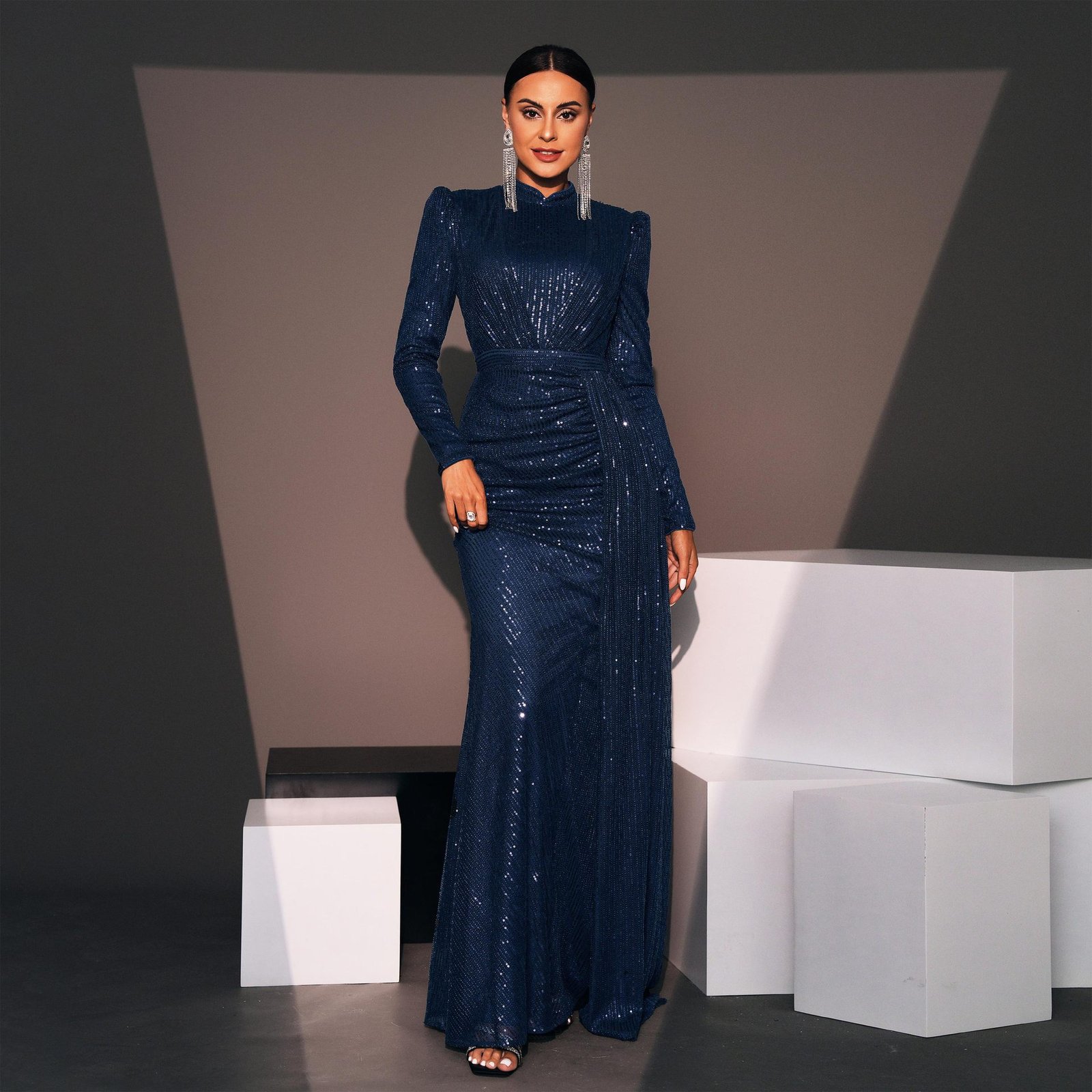 Ladywill Wholesale Sequin Prom Dresses – Cross-border Western Evening Gown Long Sleeve Elegant Round Neck Sexy Slim Fit Sequin Maxi Prom Bridesmaid Dress