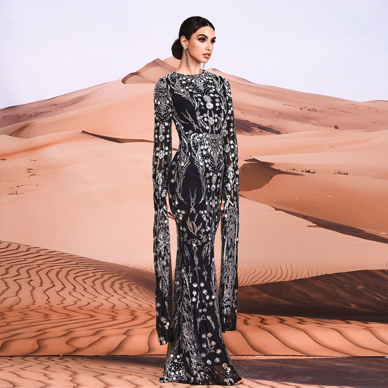 Ladywill Wholesale Sequin Prom Dresses – Cross-border Western Long Sleeve Black Sequin Striped Sheer Sexy Maxi Evening Gown With Train